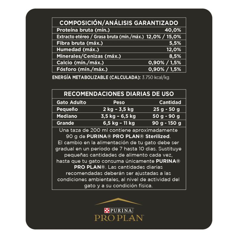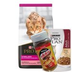 Purina Pro Plan Sterilized es un alimento balanceado de calidad super premium para gatos adultos castrados o esterilizados. Tiene en cuenta los cambios hormonales que la castración produce en tu gato, por lo que combina sus ingredientes para garantizar un funcionamiento renal óptimo. Aporta un alto contenido de fibras y proteínas reduciendo el contenido de grasa, lo que causa una reducción en las calorías de la dieta y garantizando una condición corporal ideal. Además, controla la formación de bolas de pelo.