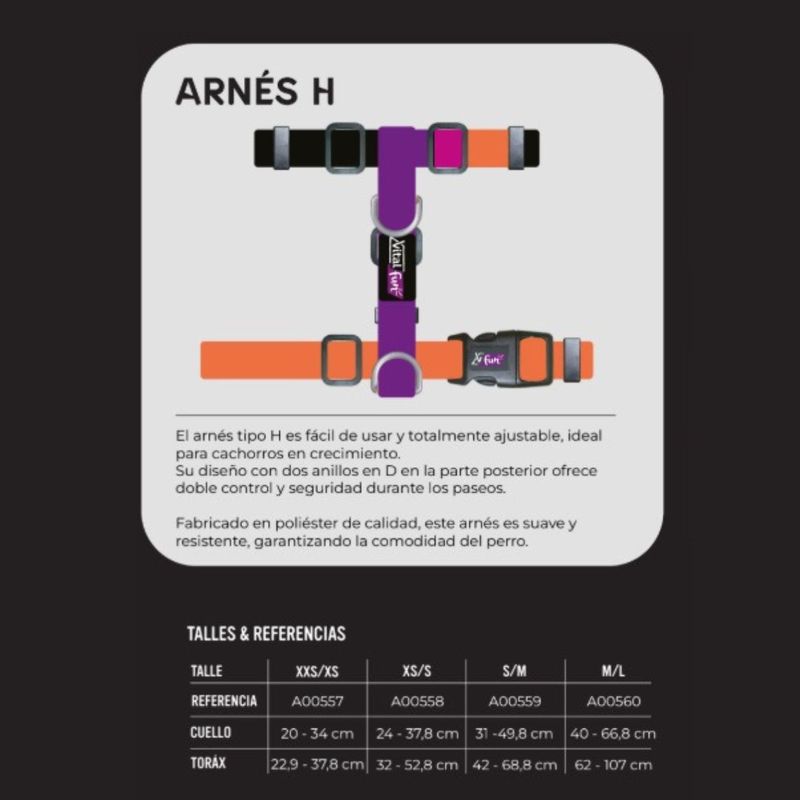 Arnés H Minimal Black Talle S/M para perros. Fácil de usar y ajustable, fabricado en poliéster de calidad garantizando la comodidad del perro e ideal para cachorros en crecimiento. Con dos anillos en D en la parte posterior ofrece doble control y seguridad durante los paseos.
