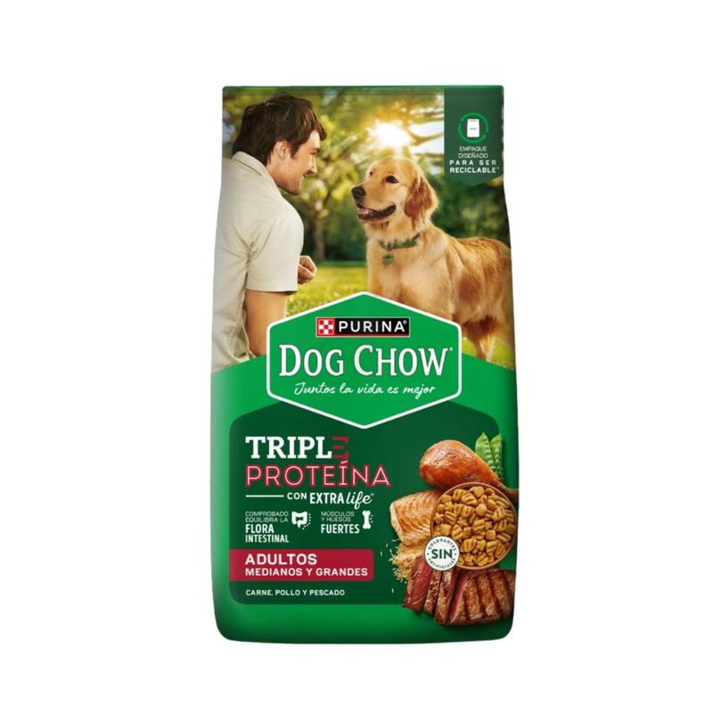 Purina Dog Chow Triple Proteina Perro Adulto Raza Mediana/Grande es un alimento balanceado para perros adultos de tamaño mediano y grande. 100% completo y balanceado. Formulado con una combinación de 3 deliciosas proteínas: carne,pollo y pescado. Ayuda a mantener los dientes limpios para una salud oral, equilibra la flora intestinal, promueve un pelaje brillante y ayuda a mantenerlo sano y en forma.