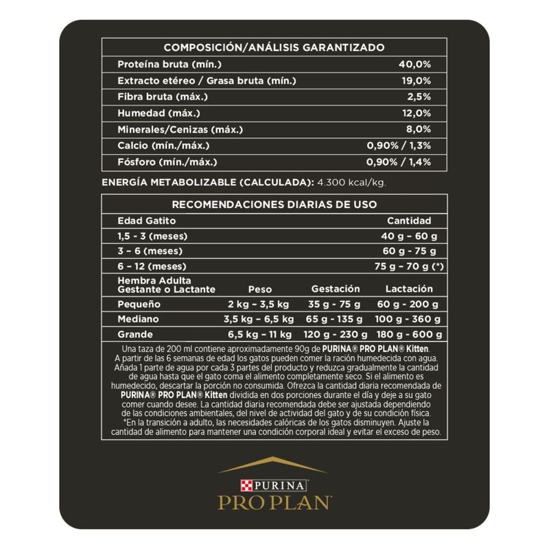 Purina Pro Plan Kitten es un alimento balanceado de calidad super premium para gatos en crecimiento de hasta 12 meses de edad y hembras gestantes o lactantes. Su exclusiva tecnología Optisatart, formulada para desarrollar y fortalecer el sistema inmunológico inmaduro de tu gatito está compuesta por anticuerpos naturales del calostro, proteínas de calidad, vitaminas y antioxidantes que ayudan a extender la protección que empezó con la leche materna, reforzando la salud intestinal del gatito y ayudando a reducir el riesgo de trastornos digestivos. Esta tecnología está indicada también para la nutrición de las madres en periodo gestante y lactante.