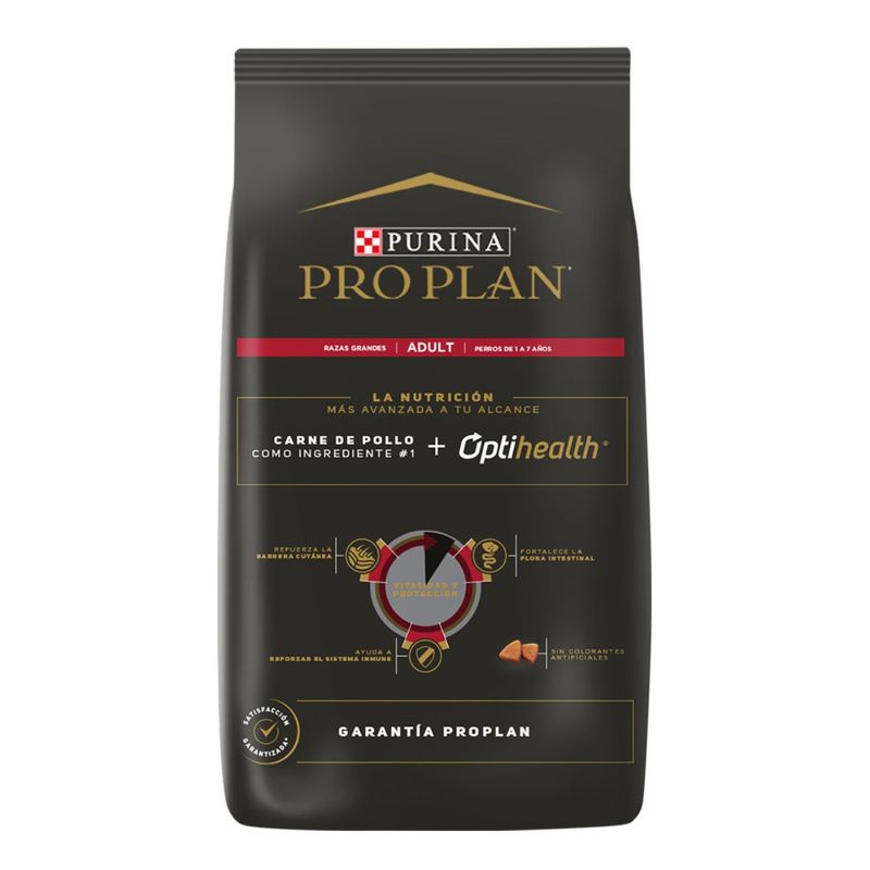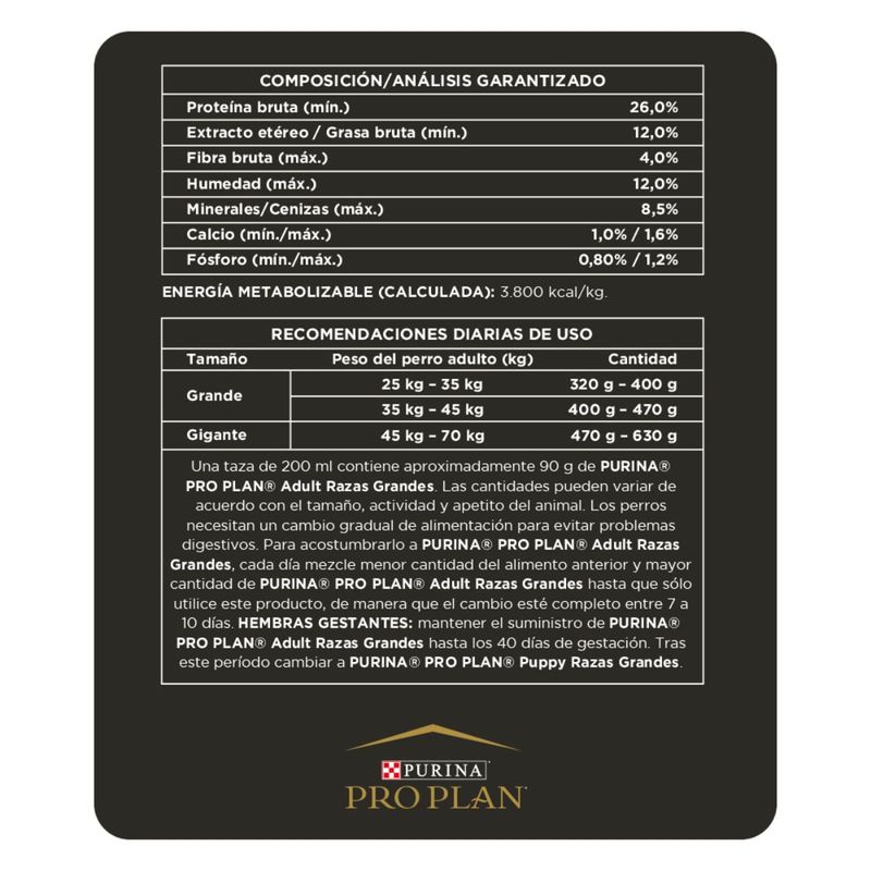 Purina Pro Plan Adulto Razas Grandes con OptiLife Triple Action es un alimento balanceado de calidad super premium para perros de tamaño grande que pesen más de 22,5 kg. Entre sus beneficios se destacan: su contenido de prebióticos bioactivos que protegen a tu mascota de posibles problemas digestivos y promueven la absorción de nutrientes; su correcto balance de proteínas y grasas que ayuda a mantener un peso saludable y los músculos fuertes; y las fuentes de glucosamina y ácidos grasos EPA junto a las vitaminas y minerales que conservan la salud de sus articulaciones, favorece una piel sana y un pelaje brilloso, colabora a conservar los huesos y los dientes fuertes, así como también, a reforzar el sistema inmunológico.