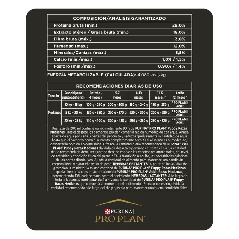 Purina Pro Plan Puppy es un alimento balanceado de calidad super premium para perros de razas medianas desde el destete hasta la edad adulta. Su fórmula protege a tu cachorro de posibles problemas digestivos y favorece la absorción de nutrientes, promueve una piel sana y un pelaje brilloso. Ayuda al desarrollo del cerebro y la visión, y refuerza el sistema inmunológico de tu cachorro. Además, la relación equilibrada de calcio y fósforo conserva sus huesos y dientes fuertes.