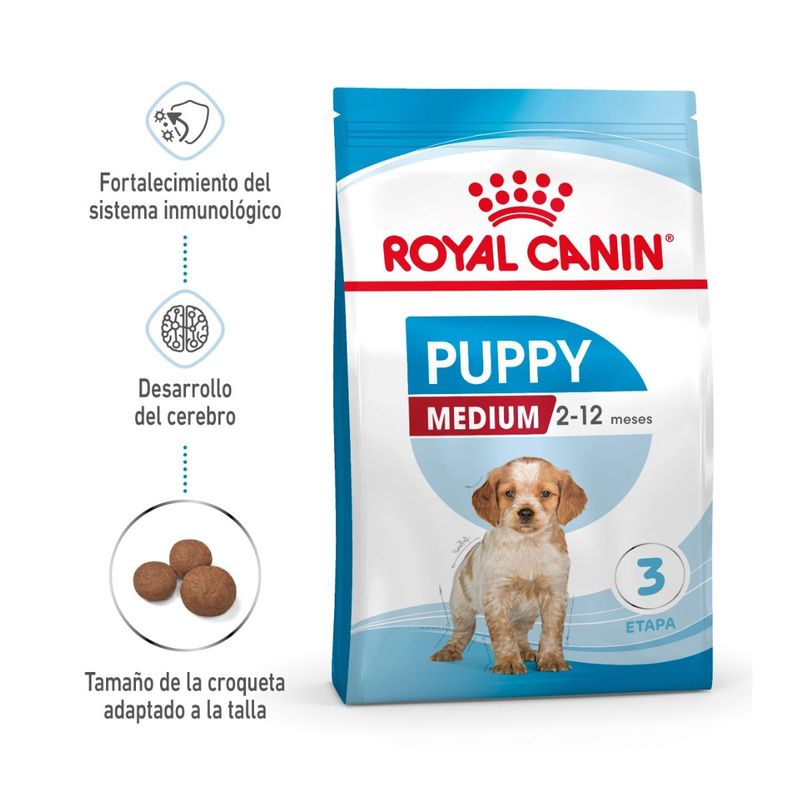Royal Canin Medium Puppy es un alimento balanceado de calidad super premium para perros cachorros de razas medianas, hasta los 12 meses de edad. Contribuye a la salud digestiva, al crecimiento armonioso y al sólido desarrollo del esqueleto.